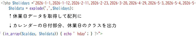 ↑はカレンダーで利用する休日データ(ここでは直接文字列を記述していますが、Advanced Custom Fields のフィールドから取得も可能)