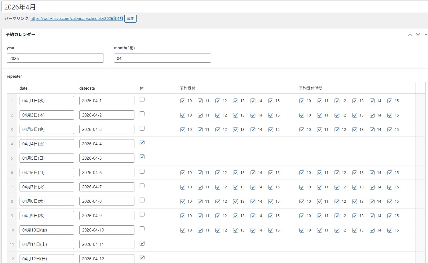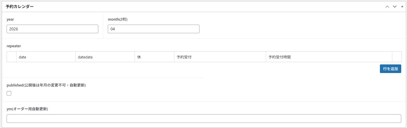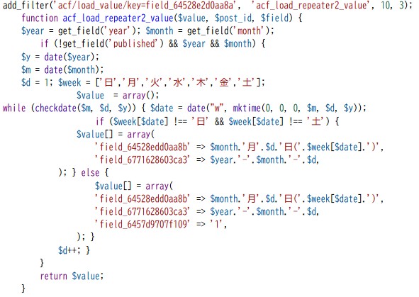 リピーターで1月分のスケジュールを作成 2026年1月3日2026年1月5日code-manageAdvanced Custom FIelds Advanced Custom Fields のリピーターで 年月を入力して下書き保存↓ 1月分のデータをロード↓ 内容を調整して公開するための関数