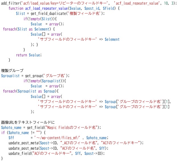 Magic Fields からAdvanced Custom FIelds Pro への移行 2026年1月7日code-manageAdvanced Custom FIelds 開発終了しているカスタムフィールドプラグインMagic Fields からAdvanced Custom Fields へ移行する関数。 値をロードして更新・保存する。 画像はアップロード先が違うのでURLを取得してテキストフィールドに保存する。 *Magic Fields を無効化する前に関数を削除する。