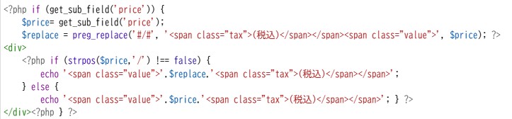 PHP 文字列の置換 2026年4月3日code-managerAdvanced Custom FIelds / PHP 複雑な入れ子になったリピーター内に価格欄があり、複数の価格設定をさらにリピーターにしたくないので、スラッシュ区切りの入力からhtml に置換する。 preg_replace の文字列は正規表現を使う。strpos は文字列を含むかどうか。 パスワードは nopassword です。