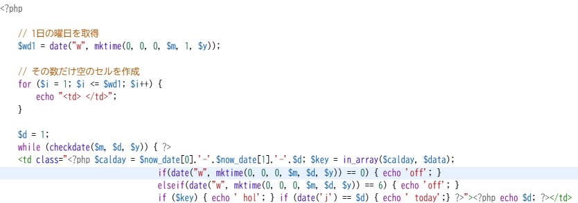 営業日カレンダー 2026年1月2日code-manageAdvanced Custom FIeldsコメントを残す Advanced Custom Fields リピーターで休業日を設定し、カンマ区切りの文字列として保存、これを配列に入れてカレンダーの日付が含まれていたらクラスをつける。 カレンダーの準備部分と 日付部分