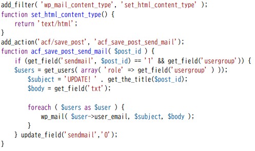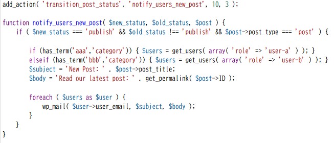 アクセス権のあるユーザーのみに通知を送る 2026年4月21日2026年4月22日ワードプレス構築ノートその他 User Role Editor でユーザー権限を作成し、ターム(カテゴリー)ごとにアクセス権を設定、紐づいているユーザーのみに新規投稿の通知を送信する関数 新規投稿時だけでなく、更新時も含め、手動でチェックして送信したい場合はAdvanced Custom Fields を利用して送信することも可能