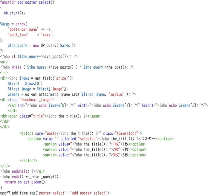 CF7 wpcf7_add_form_tag 2026年4月15日ワードプレス構築ノートContact Form 7 COntact Form 7 に投稿を読み込んで申し込む例。 投稿ごとにセレクトボックスを作成するので、フォームのメールタブにはすべてのname を入れる必要がある。 随時投稿が増えていく場合は選択1、選択2のように、投稿の選択と数量選択を別にしたほうが良いかもしれない。
