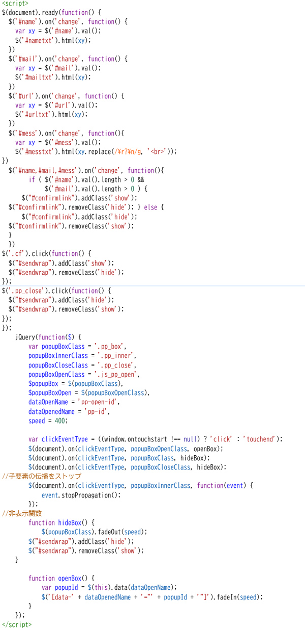 CF7 確認画面をポップアップ 2026年1月2日2026年1月2日code-manageContact Form 7 / スクリプトコメントを残す Contact Form 7 の確認画面をjQuery利用のポップアップで表示。