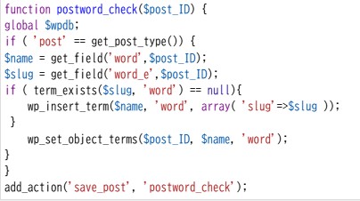 wp_insert_term 2025年12月30日2025年12月31日code-manageタクソノミー1件のコメント アルファベット順・50音順にするため、または投稿と施設の紐づけのためなど、タームを自動登録するための関数