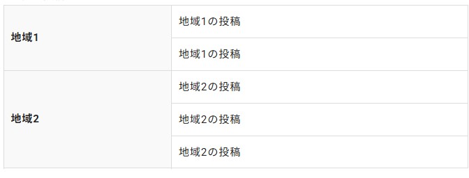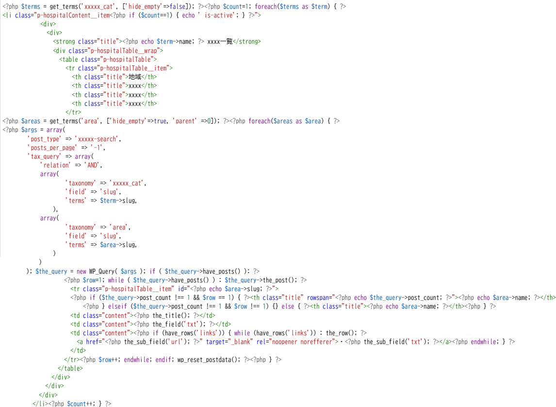 タームごとに区切ってテーブル表示 2026年1月11日2026年1月11日code-manageタクソノミー カテゴリーとエリアの tax_query tax_query でカテゴリーはリストタグで区切り、エリアはテーブルで表示。投稿数が1以上の場合は1投稿目のth にrowspan を入れ、2投稿目以降は何も出力しない。