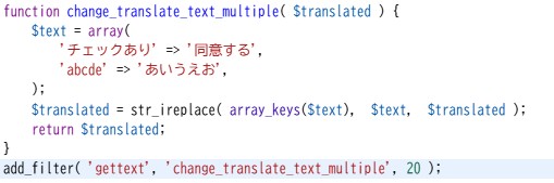 テーマやプラグインで翻訳できていないテキストや変更したい文言を設定する関数。
