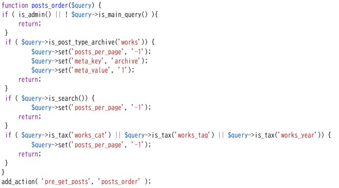 pre_get_posts 2026年1月1日2026年1月1日code-manageその他コメントを残す 特定の投稿タイプアーカイブの表示件数を変える、イベントなど開催日が今日以降のものを表示、などの設定。