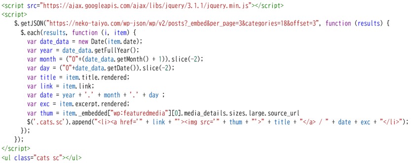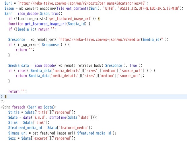 REST API カテゴリーを指定して新着を表示 2026年1月9日2026年3月26日code-managerPHP / スクリプト htmlの外部サイトにワードプレスの新着をカテゴリー指定で表示するスクリプト PHP PHPでアイキャッチを表示