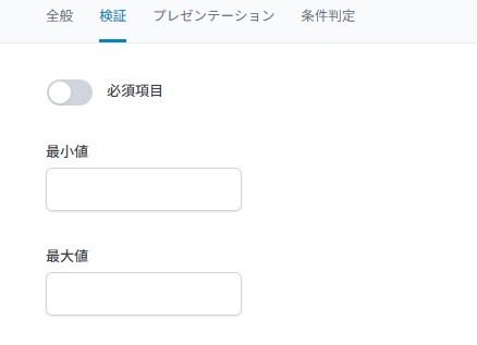 必須チェックの他、テキストフィールドなら文字数制限、数値フィールドなら最小値・最大値などを設定できます。
