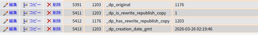 調べてみるとデータベースに_dp_has_rewrite_republish_copyというメタキーが残っているのが原因という情報があったので、担当者に見てもらうと、そのようなキーはない、あるのは_dp_original、とのこと。