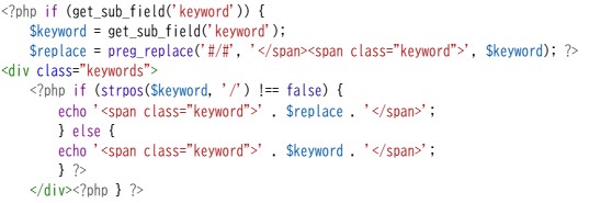 Advanced Custom Fields でフィールドを組むとき、必要であればリピーターが複雑な入れ子になっても、必要な形で組みますが、「価格やキーワードが複数になる場合もある」という程度の場合はテキストフィールドにカンマ区切りやスラッシュ区切りで入力してもらって、PHPで置換します。